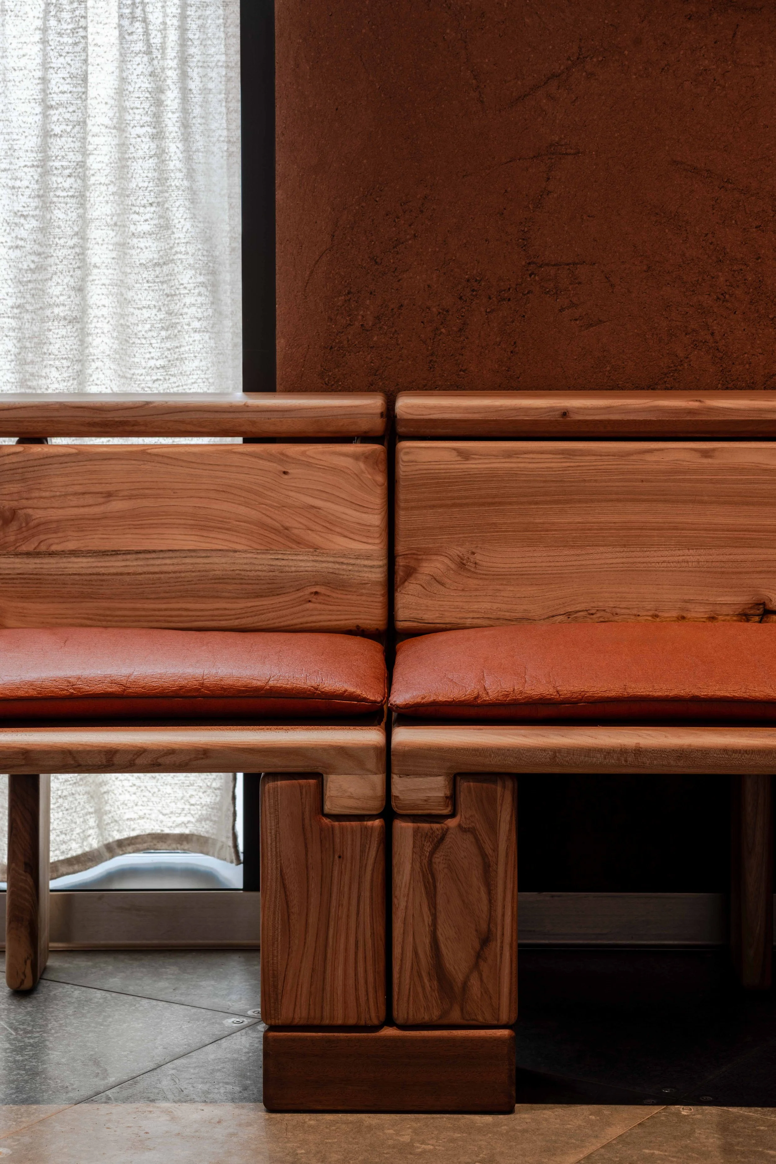 We used solid elm and iroko for all benches, tables, shelving, and cabinetry, which featured hand-shaped interlocking bench legs and cylindrical table feet.